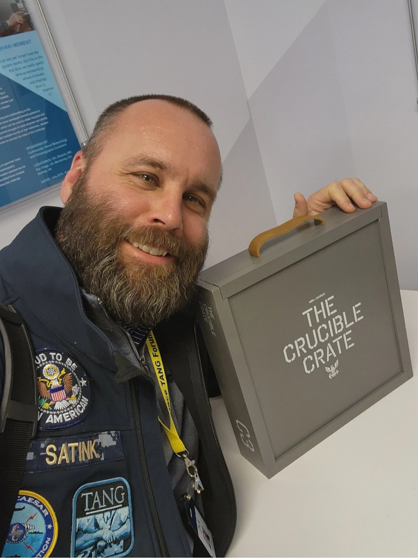 “ When I was stationed on USS Chafee back in 2014, I came up with this design, based on the three major Navy Enlsited Classifications, (NECs) that Sailors in SONAR ratings possessed. Those NECs are painted on the prongs of the trident and the classic SONAR motto “Sagire, Classis, Destructum”, (Latin for search, classify, destroy), is painted on the cloth draped over the trident.